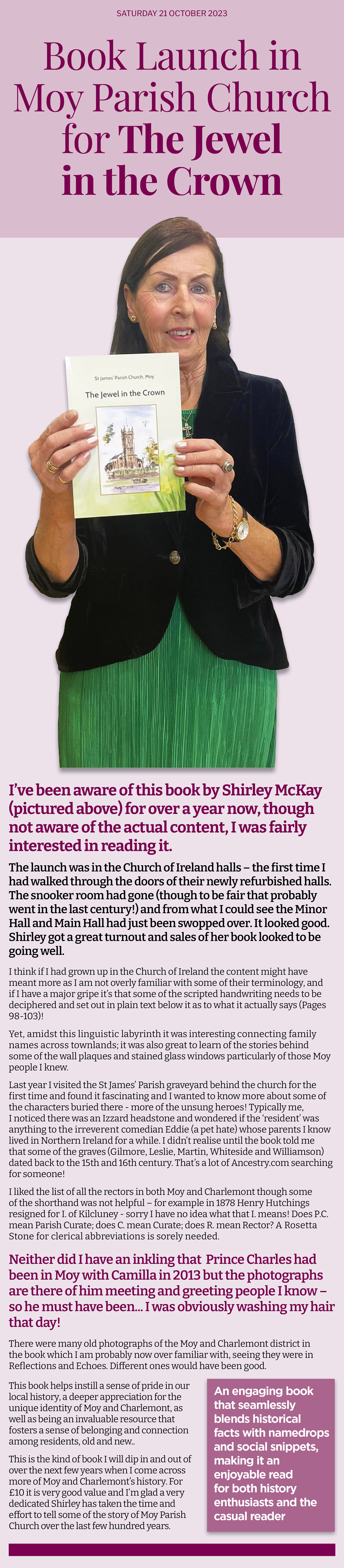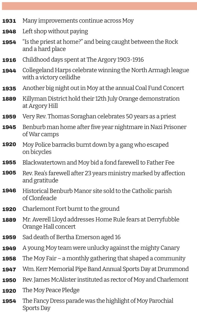 And it’s not just any old book either. It’s a 220–page collection of short stories from Moy, Charlemont, Benburb, Blackwatertown and all the little townlands scattered in between them. The years I’ve covered run from 1880 to 1960 – those halcyon days of fairs, feuds, sports days, concerts, tragedies and triumphs.